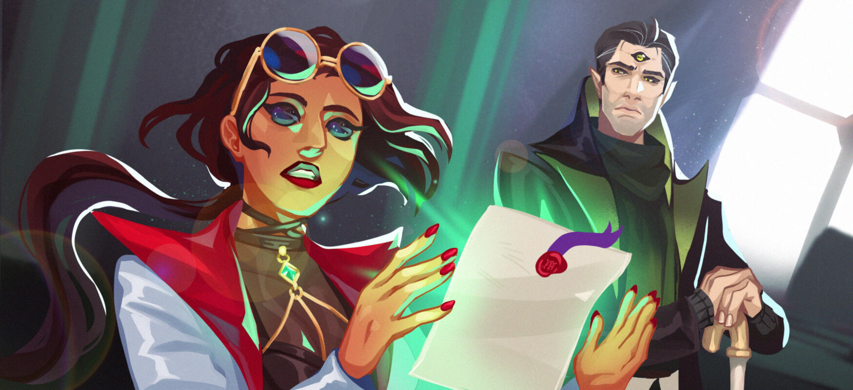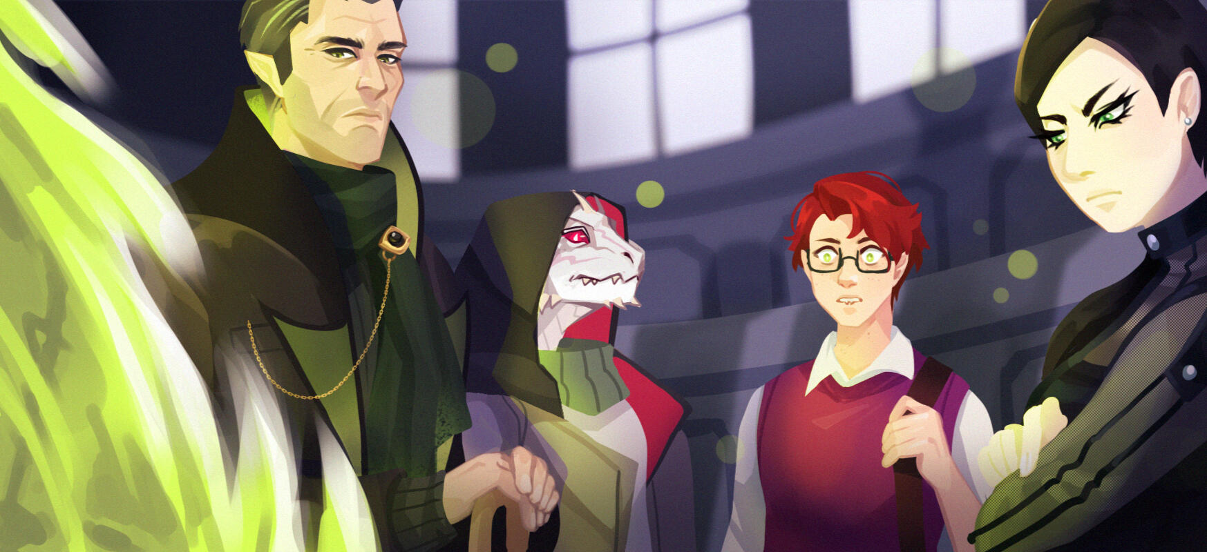 ㅤㅤ“Sit down and wait until Mr. Clement comes. He’s gonna brief us the details for our assignment.”ㅤㅤ“Mr. Clement? The assignment came from HIM? Personally? A-And- why is there a class room here?!”ㅤㅤ“You ask TOO many questions, you know that?”Elliot sunk back to his seat. Pouting. Though, he does have the right to know. All he knew is that they were to extract an artifact, but from where, he wasn’t informed as of yet. As he was about to drop another question to the witch, the door swung open. With both of the students’ attention to the door, Clement entered the room and signed them a small wave, followed with his usual polite smile. Surprisingly, he’s not alone. A hooded figure is following him. He looks short, yet what’s strikingly suspicious is that the figure had claws for feet and his tail is covered in scales instead of fur like Lycans does.ㅤㅤ“Evening, Ms. Worthington, Mr. Reese.”Walking up to the two students, Elliot couldn’t help but feel off at his presence. This man felt cold. Not like the winter, but like those nights where you are all alone and surrounded in darkness. In void. The feeling had turned Elliot pale, his green eyes flashing in wary. Though, his fear immediately broke as the other figure popped his hood down and waves at them both.ㅤㅤ“Hello!”Sarah and Elliot’s eyes went wide as they saw the figure in front of them. Pale white snout with spiky tendrils, rows of sharp teeth, glistening scales covering his skin. Could it be….ㅤㅤ“A dinosaur-!?"