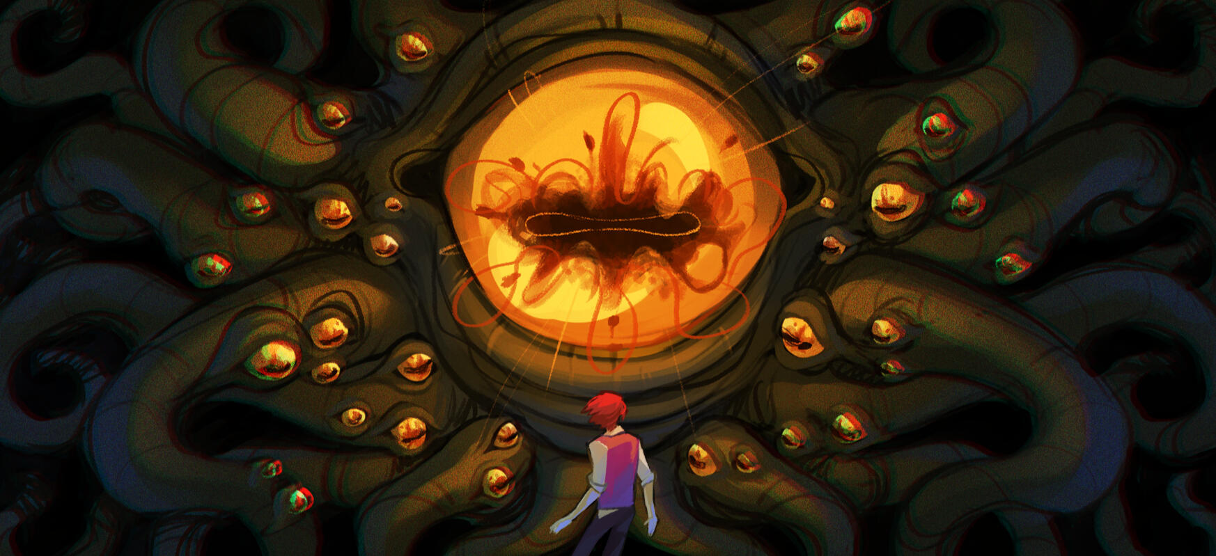 And more.The eyes start to lump and meld together and turn into a bunch of black tar, melting together while some eyes remain around, keeping its attention toward Elliot. Soon the mound grew larger and larger, floating in the middle of the library and as it fills almost the entirety of the room, a large eye spuns from its core and lands its gaze into the terrified vanguis.ㅤㅤ“REESE… OF RAITH.”Elliot stood frozen on his two feet. The voice. It’s Clement, but at the same time, it is not? The creature in front of him feels massive, thousands of olive-tinted eyes protruding from its black tar of a ‘body’, blinking one by one as the other keeps its cold gaze through his soul.ㅤㅤ“Mr. Clement?”